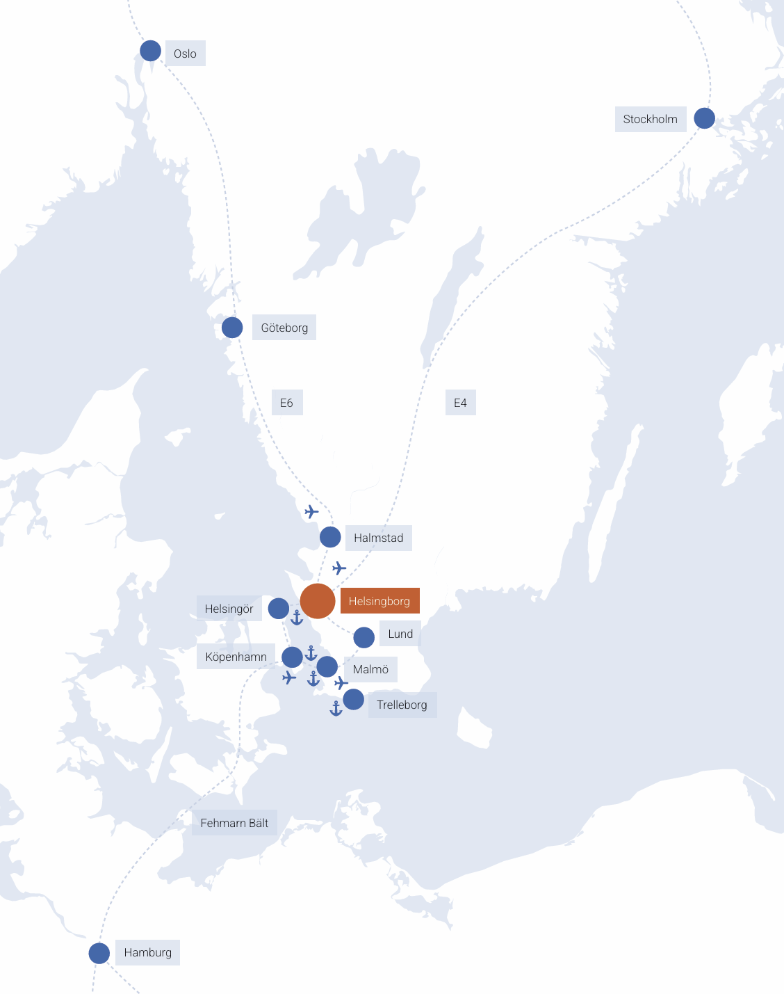 Helsingborg har norra Europas mest strategiska läge och finns mitt i en av Europas mest dynamiska område för tillväxt. I Helsingborg knyts Norden och kontinenten ihop tack vare direkt tillgång till både E4 och E6, Öresundsbron, ett växande nät av tågförbindelser, färjetrafik till Helsingör och sjöfart till och från Sveriges näst största containerhamn. Det ger dig snabb och smidig åtkomst till såväl svenska som internationella marknader.